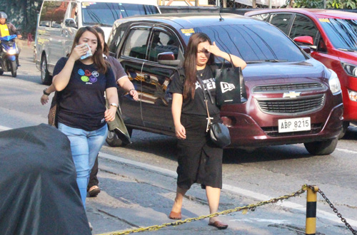 日光を手で遮る歩行者ら=22日午後4時半ごろ、首都圏マカティ市で森永亨撮影