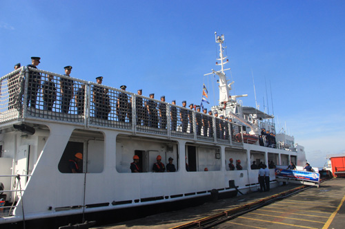 マニラ南港を出港する比沿岸警備隊の巡視船=8日午前8時半ごろ、首都圏マニラ市で加藤昌平撮影