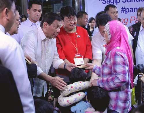 恩赦を受け帰国したOFWに支援金を手渡すドゥテルテ大統領=大統領府提供