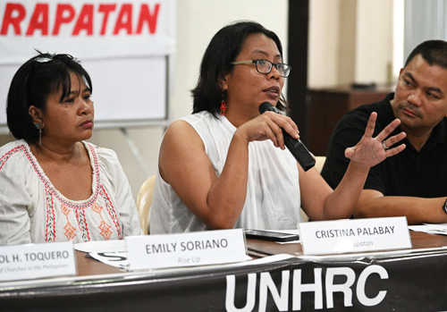 国連人権理事会の決議後、記者会見で語る人権団体の活動家ら=12日、首都圏マニラ市(AFP=時事)