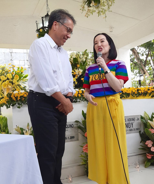 今年5月の上院候補で落選した元内務自治長官のマー・ロハス氏(左)と女優のクリス・アキノ氏=21日午前、首都圏パラニャーケ市のマニラ・メモリアル・パークでセレリーナ・モンテ撮影