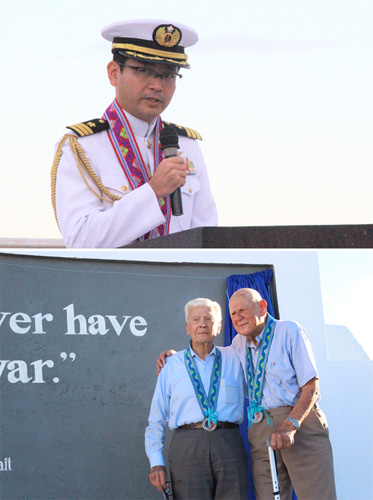 (上)4カ国の国旗が掲げられたスリガオ海峡に臨む広場であいさつする福田法訓防衛駐在官=25日午前6時ごろ、ミンダナオ地方スリガオ市で森永亨撮影。(下)オーストラリア海軍の重巡洋艦シュロップシャーに共に乗艦していたガイ・グリフィス元少将(左)=当時は大尉=とデイビット・マティスク元砲術士=24日午後4時ごろ、ミンダナオ地方スリガオ市の記念碑の前で森永亨撮影
