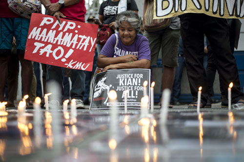 ドゥテルテ政権の麻薬取締政策を批判、超法規的殺人の犠牲者のためにろうそくを灯して抗議を行う人々=2017年8月23日撮影(AFP=時事)