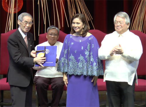 授賞式でロブレド副大統領から記念の盾を受け取った石澤良昭教授=31日午後5時ごろ、首都圏パサイ市でクリスチャン・ディミトゥイ撮影