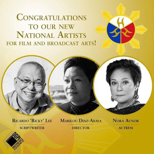 映画界から今年の国民芸術家に選ばれたリー氏(左)、アバヤ氏(中央)、そしてオノ―ル氏(右)の3人=比監督組合が作成した受賞を祝福するポスター