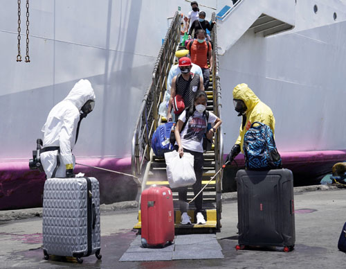 フィリピンに帰国後、約2週間の隔離措置を経て、政府の用意した船でセブに帰郷した海外就労者たち=5月23日撮影(EPA=時事)