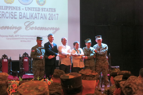 比米両軍による合同軍事演習「バリカタン2017」が8日始まり、首都圏ケソン市の国軍本部で開始式が行われた。ルソン地方ヌエバエシハ州のマグサイサイ陸軍...