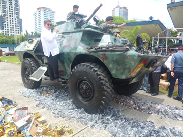 知的所有権事務局、計約15億ペソ相当の模造品を押収したと発表。押収品を装甲車で破壊