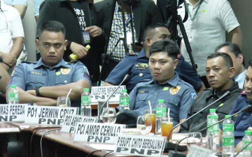 公聴会に出席した高校生殺害容疑の警官ら=24日午後4時ごろ、首都圏パサイ市でクリスチャン・ディミトゥイ撮影