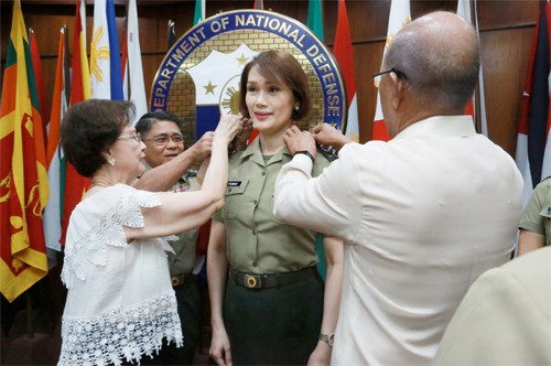 予備役に興味を示していたジェラルディン・ロマン下院議員=ルソン地方バタアン州=が14日、首都圏ケソン市の国軍本部でロレンサナ国防長官の承認の下、陸軍...
