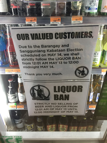 バランガイ選挙に伴い、酒類販売中止を知らせる貼り紙=12日深夜、首都圏マカティ市のコンビニエンスストアで米元文秋撮影