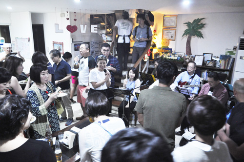 記念パーティーで挨拶する中村八千代さん(写真中央)=8月4日午後6時すぎ、ユニカセで澤田公伸撮影