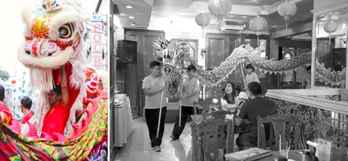 (左)中国から寄贈された龍を高々と掲げる男性=5日午後2時ごろ、首都圏マニラ市で岡田薫撮影/(右)食事客も竜舞による祝福を受ける=5日早朝、ネットワールドホテル・スパ・アンド・カジノ提供