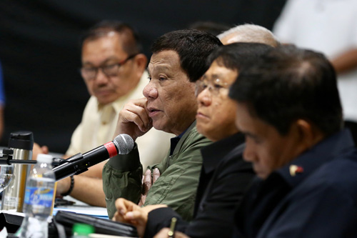 14日、ミンダナオ地方ダバオ市での国軍・警察司令会議で麻薬政治家リストを発表したドゥテルテ大統領=大統領府提供