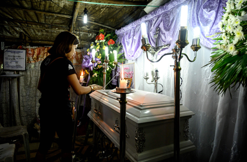 3歳で「ドラッグ戦争」の犠牲になった女児マイカ・ウルピナちゃんの棺(ひつぎ)を見つめる母親。マイカちゃんは6月30日、自宅で警察による違法薬物捜査の際...
