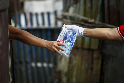貧困層の家庭に衛生キットを配布するケソン市職員(EPA=時事)