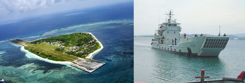 (左)南沙諸島で比が実効支配するパグアサ島(カラヤアン町提供)/比海軍の大型上陸用舟艇「BRPイバタン」(比国軍の公式ホームページから)