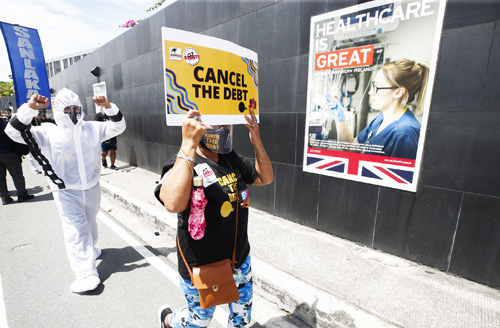 英国で開かれるG7サミットにあわせ、タギッグ市の英国大使館近くでコロナ禍による貧困国の苦境を訴えるデモ参加者ら(EPA=時事)