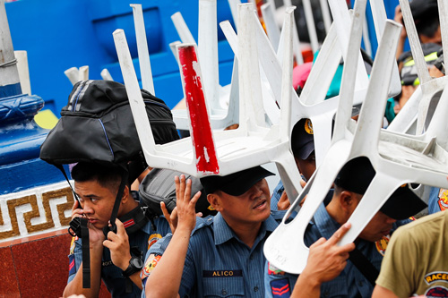 地震避難訓練で、いすやかばんなどで頭を守る警察官=14日、マニラ首都圏(EPA=時事)