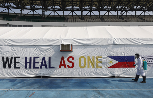 ブラカン州ボカウエのフィリピン・スポーツ・スタジアムの仮設テントに「一体となって(病いを)癒す」の言葉=(EPA=時事)