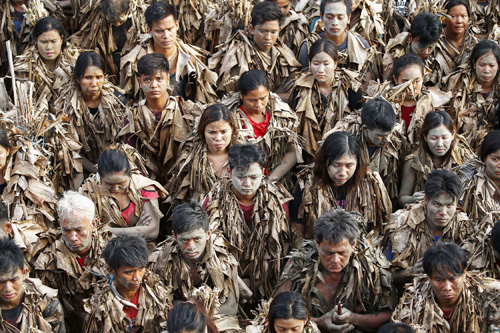 全身に泥を塗りバナナの葉をまとった「泥の人祭り」参加者(EPA=時事)