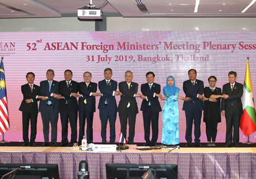 31日、バンコクでの東南アジア諸国連合(ASEAN)外相会議に集まった各国外相ら。左から4人目がロクシン・フィリピン外務長官(EPA=時事)