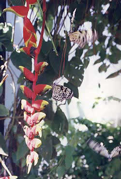 入場するとまず、別室で十分間ほどチョウの生態を説明したビデオを見せられる。その後、二百平方メートルほどのガーデンに案内されると、広々とした庭園にさまざまな南国の植物と、それに群がるチョウが目に飛び込んできた。ミカドアゲハに似た白と黒のコントラスト鮮やかなもの、カラスアゲハのように黒地に青いしっぽをつけたチョウがあちこちで飛んだり、羽を休めたりしている。アゲハチョウやモンシロチョウの仲間たちという。