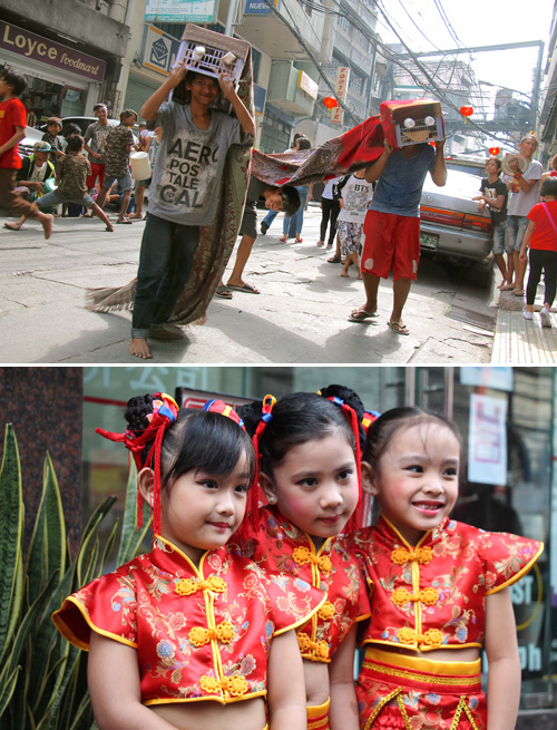 (上)廃材を利用した獅子で舞いを披露する子どもたち。(下)家族で中華料理店を訪れた少女たちはチャイナドレスでおめかし=首都圏マニラ市のビノンド地区で冨田すみれ子撮影