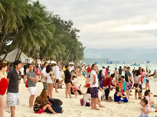 観光客でごった返すボラカイ島のホワイトビーチ=ビサヤ地方ボラカイ島で冨田すみれ子撮影