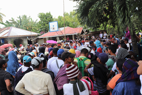 スミフル事務所前に詰めかけた労働組合員ら=6日午前、ミンダナオ地方コンポステラバレー州で岡田薫撮影