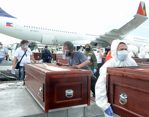 サウジアラビアからマニラ空港に到着したOFWらの遺体(EPA=時事)