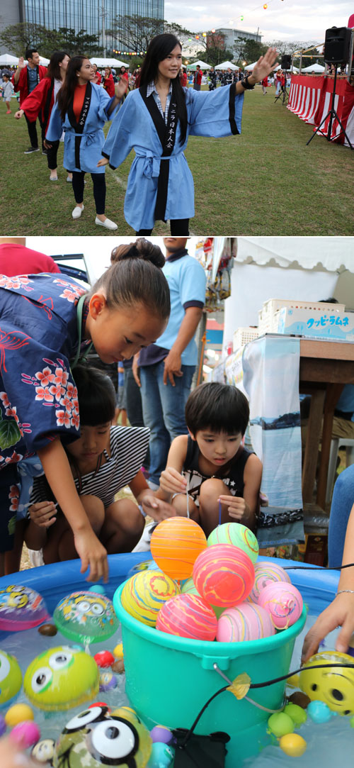 (上)やぐらを囲んて盆踊りに興じる来場者たち。(下)ヨーヨー釣りを楽しむ子どもたち=4日午後5時半ごろ、首都圏タギッグ市マニラ日本人学校で加藤昌平撮影