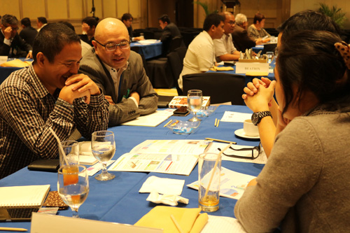 省エネ製品について商談を進める比日の参加企業=23日正午ごろ、首都圏マカティ市で加藤昌平撮影