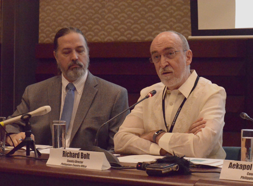 比経済の成長予測を説明するボルトADB比局長(右)=26日午前9時半ごろ、首都圏マンダルーヨン市で伊藤明日香撮影