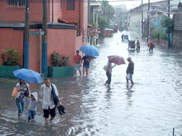 洪水の中を歩く庶民=首都圏マカティ市で3日午後5時ごろ写す