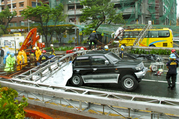 強風で倒壊し、走行中の車両3台を直撃した看板=27日午前10時40分ころ、ブエンディア通りとサウススーパーの交差点付近で写す
