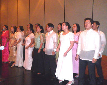 壮行会で歌を披露する第8期奨学生ら=4日午前11時半ごろ、首都圏マカティ市マンダリンオリエンタルホテルで写す