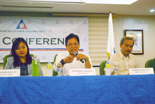 記者からの質問に答えるベリョ長官=5日午前10時半ごろ、首都圏マニラ市の労働雇用省庁舎で岡田薫撮影