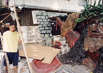 巨大なキリスト像をあしらった祭壇を片づける男性=マカティ市ポブラシオンで20日午後4時半ごろ写す