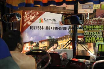 前のバスにクラクションを鳴らすマサンカイさん=19日午後11時ごろ、首都圏モンテンルパ市アラバンで写す