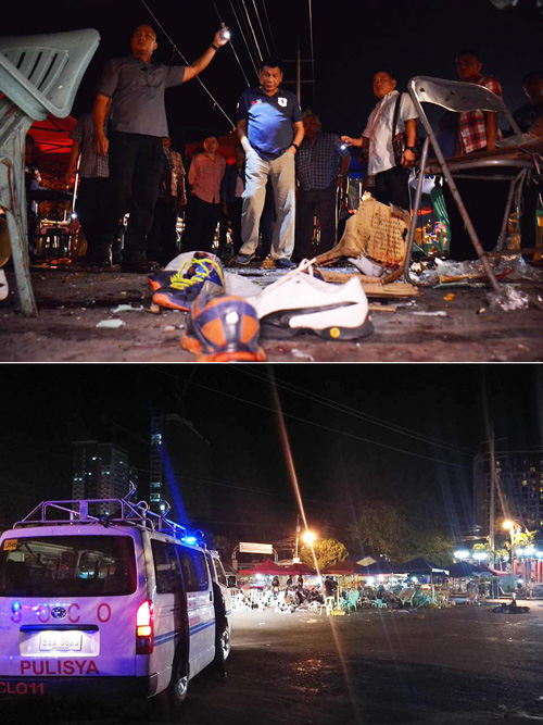 (上)爆発があった現場を訪れるドゥテルテ大統領=大統領府提供。(下)爆発があった市場=ダバオ市提供