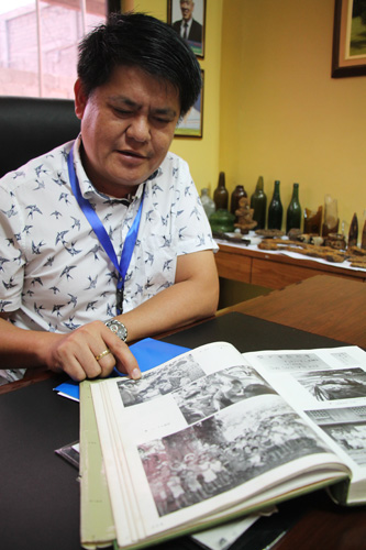 当時の写真資料を前に事業を説明するバルガメント議長=12日午後1時半ごろ、ミンダナオ地方ダバオ市ミンタル・バランガイ(最小行政区)ホールで冨田すみれ子撮影