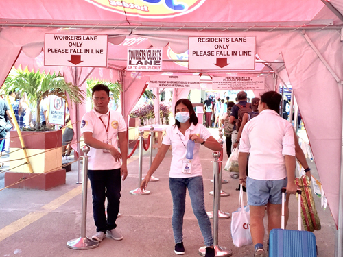 パナイ島カティクラン港に設置されたチェックポイ ント。 26 日以降はここでボラカイ島に向かう観光客 は止められる= 24 日午後、冨田すみれ子撮影