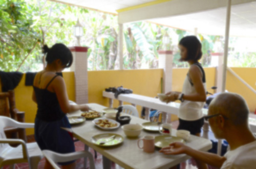 ダバオの前校舎で生徒らと食事をとる川内肇被告(右)=昨年10月、ダバオ市で伊藤明日香撮影
