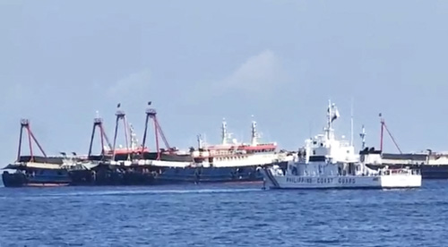 南シナ海の南沙諸島海域で中国漁船に近づくフィリピン沿岸警備隊の船=4月27日撮影、沿岸警備隊提供(AFP=時事)