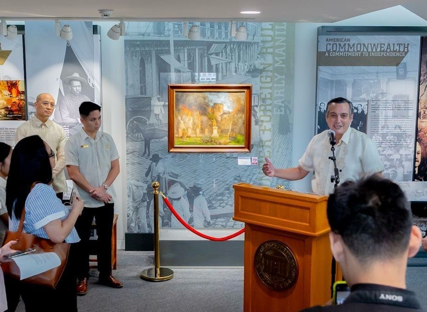 国民的画家のフェルナンド・アモルソロが爆撃で燃えるサントドミンゴ教会を描いた作品の前で行われたオープニング式典=在比米国大使館のプレスリリースより