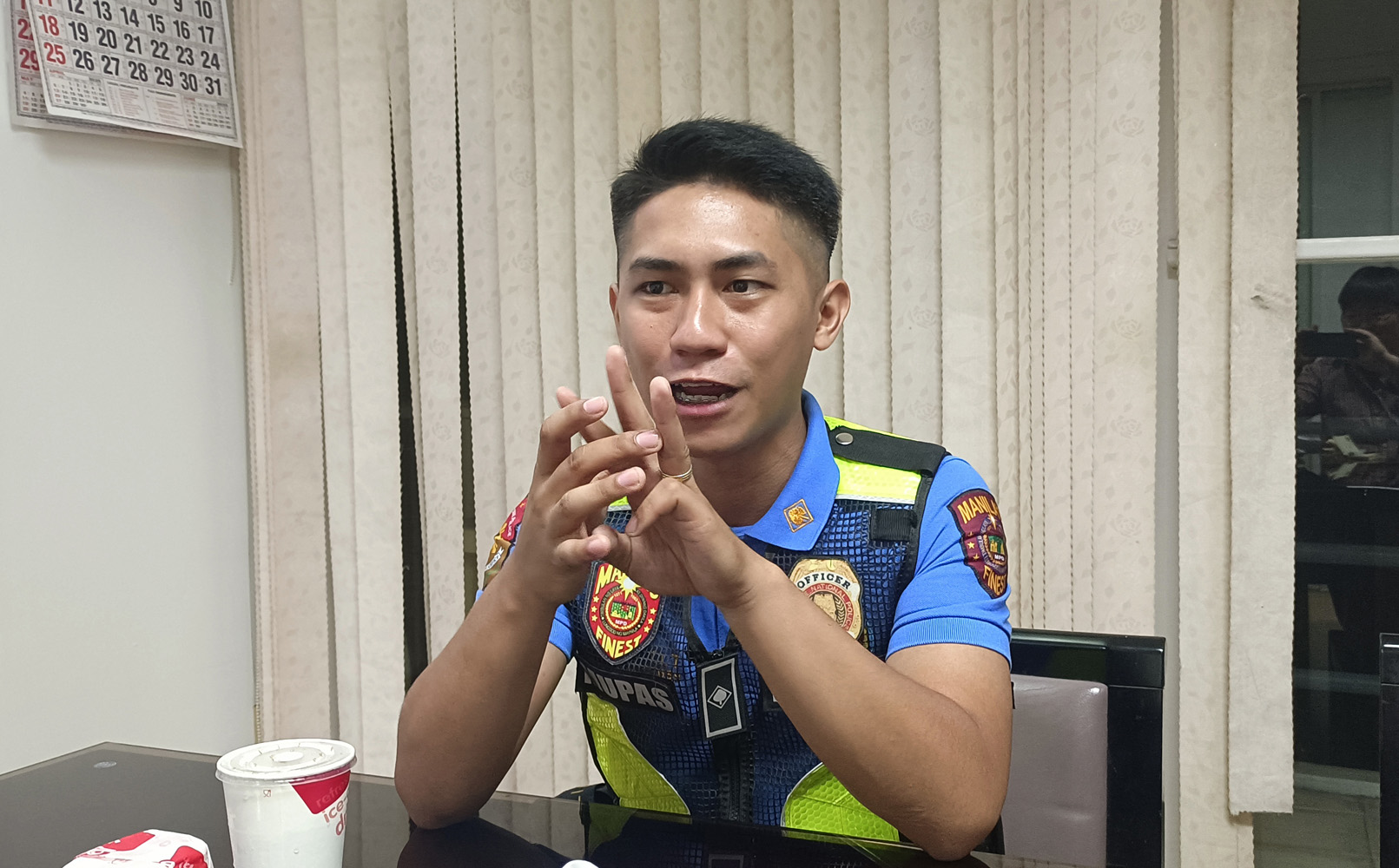まにら新聞の取材に対応する首都圏警察レメディオス派出所のムパス所長=7日午後8時ごろ、首都圏マニラ市マラテ地区で竹下友章撮影