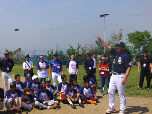 参加した子供たちに安全な走塁方法を指導する駒田徳広さん =25日午前10時40分ごろ、首都圏マニラ市トンドで写す