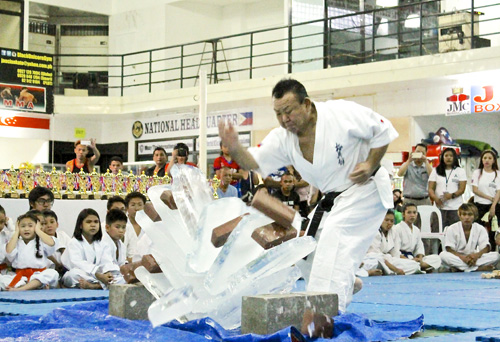 氷の板5枚を素手で割る桜井支部長=7日午前11時ごろ、首都圏マカティ市マカティシネマスクエアで冨田すみれ子写す