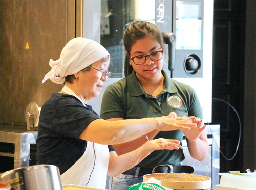 淡交会マニラ協会のティさん(左)に指導を受けながら和菓子作り体験をする参加生徒=26日午後2時半ごろ、首都圏タギッグ市のエンデラン大学で冨田すみれ子撮影